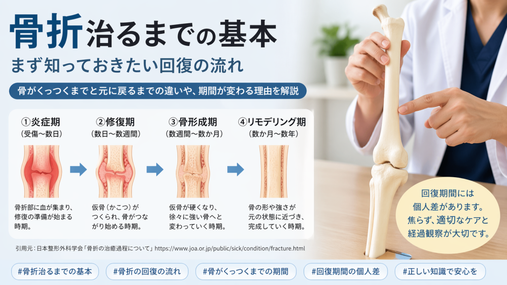 骨折治るまでの期間が気になる方へ。骨が治る流れ、部位別の回復目安、治るまでに差が出る理由、回復中の過ごし方、受診の目安までわかりやすく解説します。